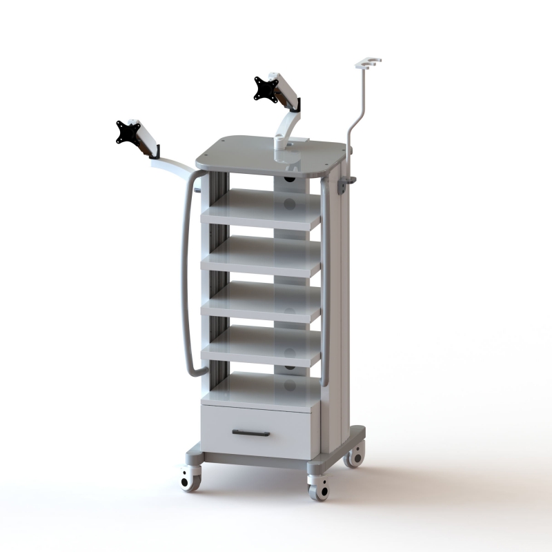 This medical computer trolley is equipped with two VESA-compatible brackets and five-layer table tops, serving as an efficient mobile workstation that can meet the needs of various scenarios. Its four lockable wheels allow easy movement between different rooms. Mobile workstations are commonly found in busy environments such as beauty salons, laboratories, and hospitals. When you leave your working environment, you can store documents or equipment safely in the lockable drawer. Roll this trolley into hospital wards to improve diagnostic efficiency.